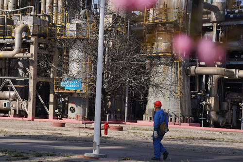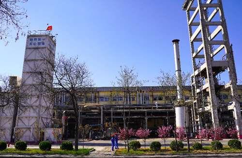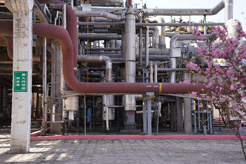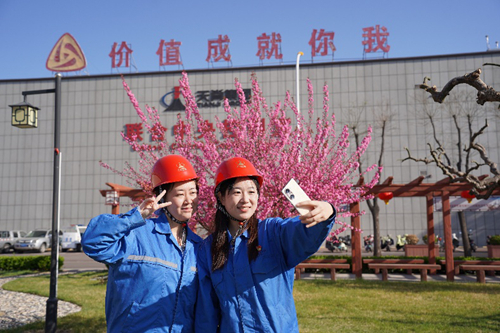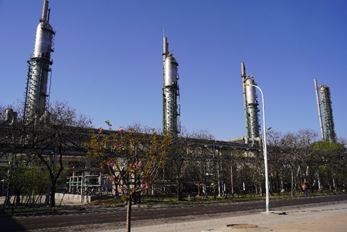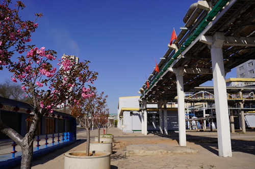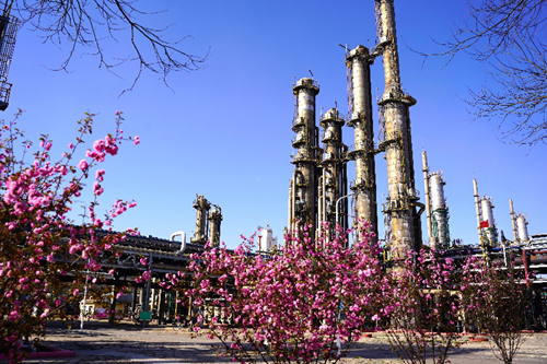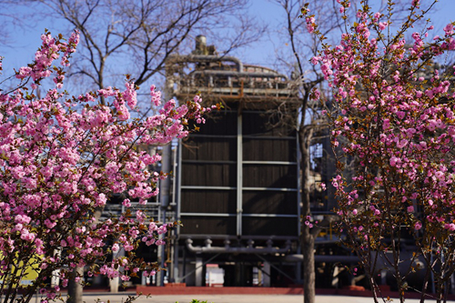 厂区内一树树樱花次第绽放,给奇妙的化工又添加了一份独特的浪漫。高耸的化工塔器,在湛蓝天空的映衬下充满生机。周边盛放的繁花,粉蕊点点,与化工装备相互交织,绘就出一幅别样的春日图景。管道林立,似在诉说着化工的韵律,“安全是最大的效益”的标语,彰显着天脊对安全与价值的双向奔赴。
