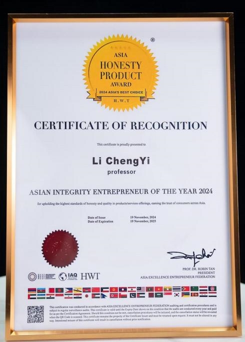 亚洲诚信大奖(Asia Honesty Award, AHA) 由亚洲精英 企业家联盟 AEEF 主办,豪威国际集团HWT GROUP 与国际品质促进会 IAQ 协办。奖项设立宗旨在于推动企业诚信度, 以表扬他们以诚信为本的崇高精神.自 2013 举办至今,亚洲诚信大奖已成为商界的信誉标志,被广泛主流媒体与 机构媲美为“商界诺贝尔“ ,每年吸引超过万家企业争相提名。该奖项一共分为 5 个项目:亚洲年度蝉联百强诚信 品牌大奖、亚洲年度百强诚信品牌大奖、亚洲诚信企业大 奖、亚洲诚信企业家大奖、亚洲诚信产品大奖,至今,已有超过 1000 个来自世界各地优秀品牌,获得此项殊荣,成为消费者心目中的优质与诚信品牌的代表,获奖品牌能 够在激烈的市场竞争中以诚信经营脱颖而出。因李乘伊教 授在中医理疗,推进人类健康发展过程中倡导的正直和诚 信,被授于亚洲诚信企业家大奖。