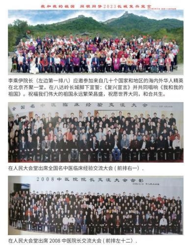 成就与荣誉的背后,是李乘伊教授为中医传承事业默默 奋斗的决心,也见证了他为祖国中医药事业创新与发展做出 巨大贡献,特别是他对中医药学的理论研究和实践探索,填 补了世界中医药领域的空白。由于他为传统中医的传承及当 代中医事业的创新与发展做出的卓越贡献,被称之为当代中 医事业的创新与发展的开拓者与奠基人。