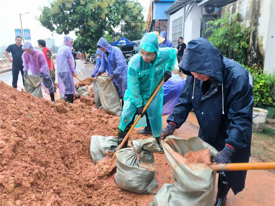 危急时刻,村支书通过村广播大喇叭发出号召,动员全体村民参与抗洪抢险。听到广播的乡亲们纷纷扛起锄头、拎着蛇皮袋奔赴河岸。挖掘机挖土,村民们分工协作,我们驻村队员们也加入战斗,有人快速装袋,有人接力传递,有人俯身堆砌,众人齐心筑起一道坚实的防洪堤。