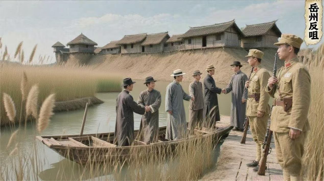 1928年1月18日(腊月二十八日)晚,周逸群、贺龙等1O人带着5支短枪,化装成商人,包一小火轮离开武汉,溯长江西进。2O日,行至岳阳城陵矶码头对岸的观音洲,得知洲上有15人、1O支枪的巡江团防队,便上岸机智地缴了他们的枪,还特意给他们打了张“借条”。