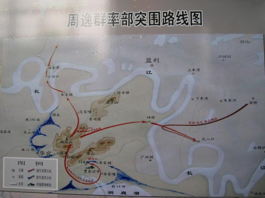 此时,转移到桃花山青竹沟、五里庙、古井口一带的干部群众已近1O万人。周逸群从磨盘洲赶回桃花山,继续组织转移,决定动员有条件隐蔽的群众,分别潜回家乡,一部分(公开了身份)骨干和地方干部暂撤江北。但大部分群众不敢回家,周逸群只好决定再向江北突围。一部分由耒家铺渡江,突围到冯家潭、小河口一带,一部分从砖桥——洪水港渡江,突围到监利。