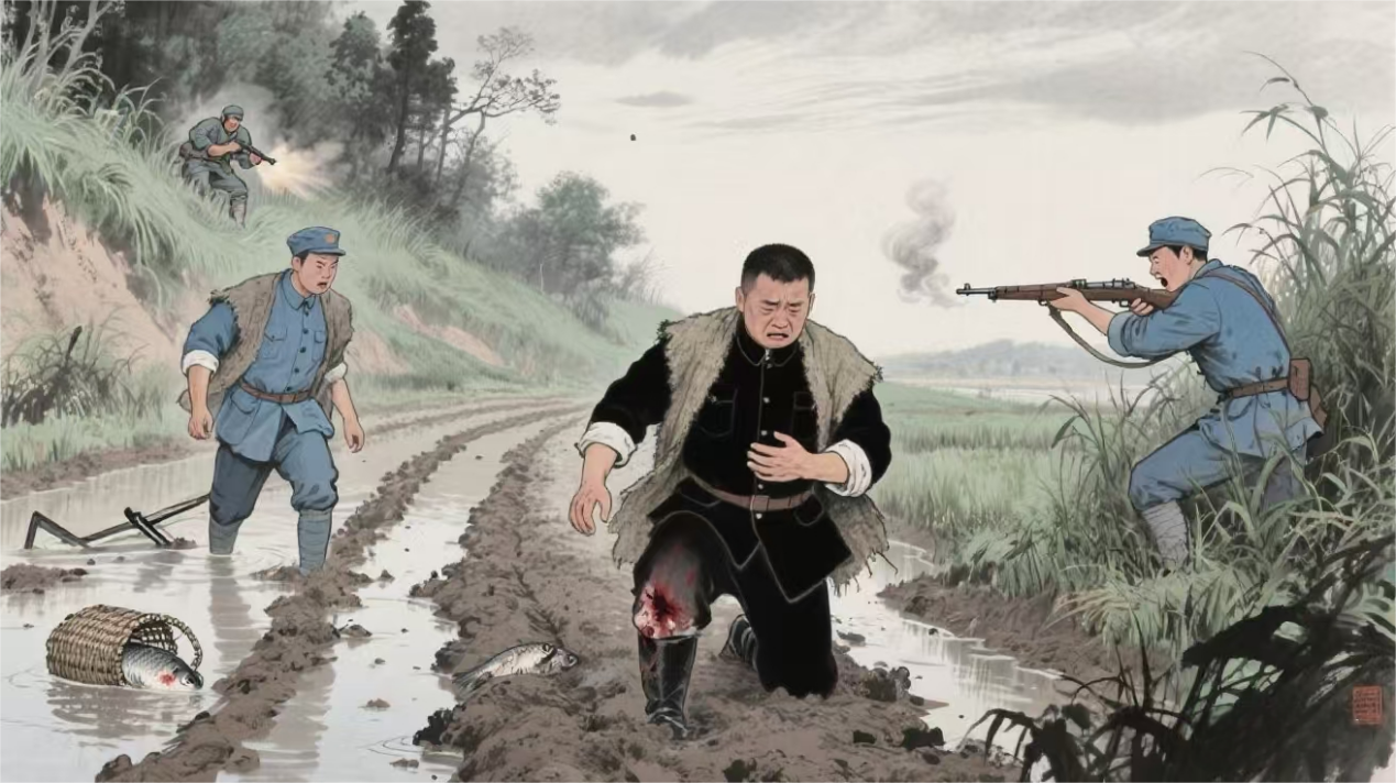 当他们靠东边走到岳阳贾家凉亭王家屋场 (今君山区许市镇)时,前面突然响起了一阵枪声。原来他们在此遭到了敌人的伏击。战士郭忠贵猛地甩出一颗手榴弹,大喊:“华容八阎王,在此,谁敢上来?”