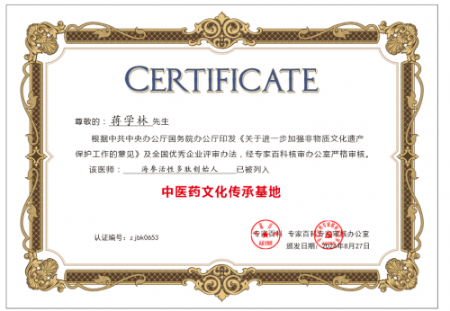 蒋学林海参活性多肽创始人|己被列入中医药文化传承基地