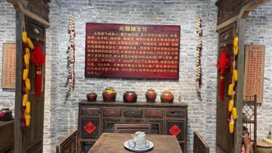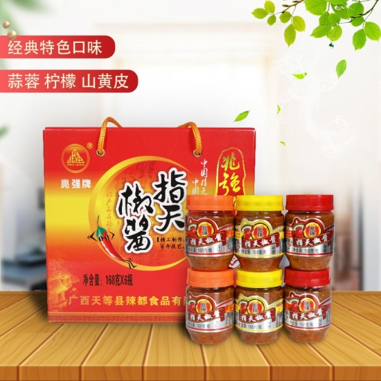 《兆强牌》指天椒酱采用天等特产天等指天椒精制而成,味辣、色美、品香,不含胆固醇,县有丰富的蛋白质、纤维素、维生素 B和C、Fe和Ca等微量元素,是人体不可缺少的保健调味品。与同类产品相比具有独特的风味。曾荣获 2000 年广西创新计划新产品交流交易会金奖。