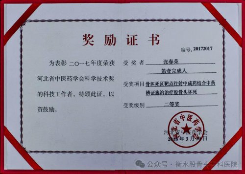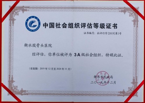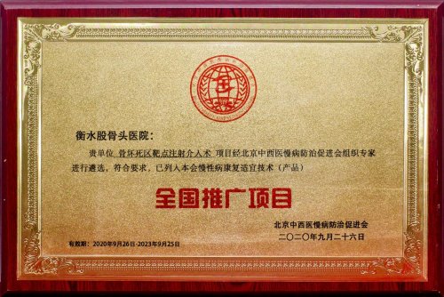 2019-2020年,连续2年被中国社会组织评选为3A级社会组织。同时,连续申请和拿下多项医疗专利,“骨坏死区靶点注射介入术项目”被北京中西医慢性病防治促进会列入全国推广项目。