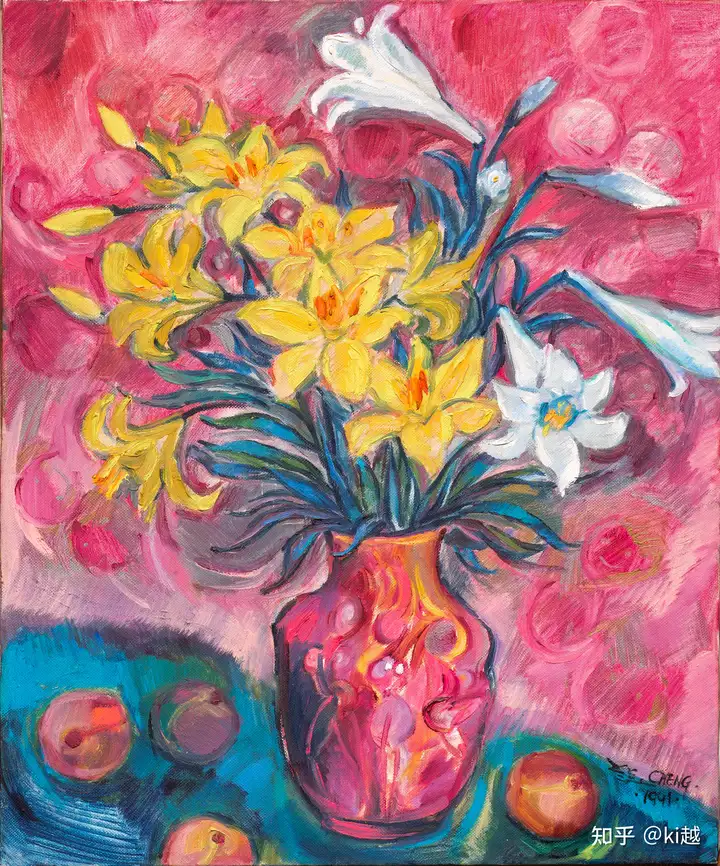 其实接近并了解她的人和画者知道她不是专精一则,犹如毕卡索蓝色和绿色时期一样,由玫瑰花转移贯注在水果静物,及间中户外采景写生方面,同样地:显现出另一才能,她所持之理念是精诚所致、金石为开,而肇造的结果,在她笔底不管任何画类题材,只要专注不放手,摒弃一切困难与生活琐务,必然达到圆熟而丰收成果。