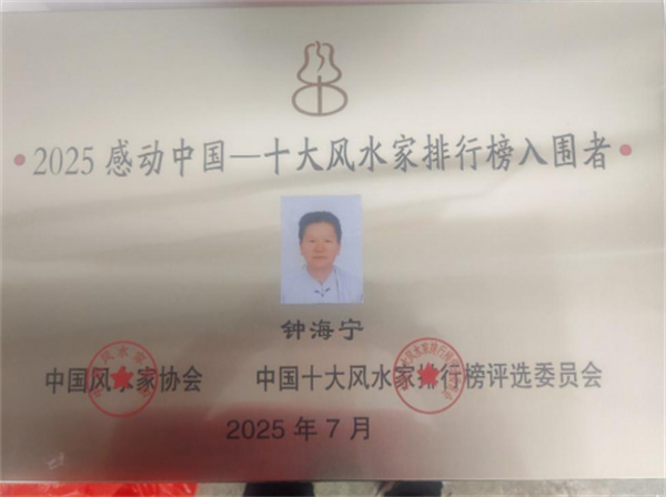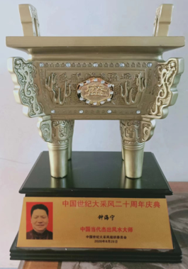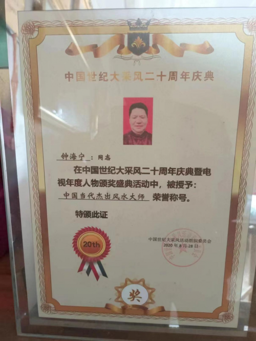 2020年8月28日在中国世纪大采风二十周年庆典暨电视人物颁奖盛典:授予:中国当代杰出风水大师荣誉称号!2022年10月20日人民代表报形象展示四分之一版“以德济世、以易结缘”一记优秀国学文化传承人钟海宁刊登。